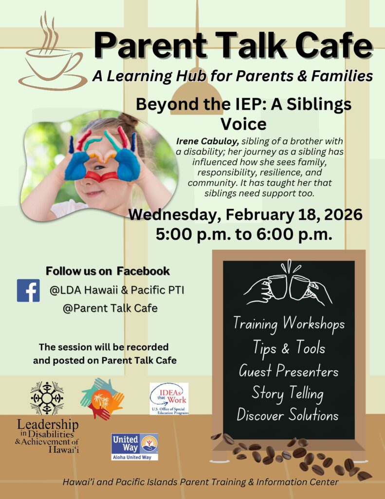 In the meantime, check out our Parent Talk Cafe Facebook page! A learning hub for parents and families! Join our live streams with professionals and watch videos for tips on nutrition and IEP meetings! To learn more, click on the link below!