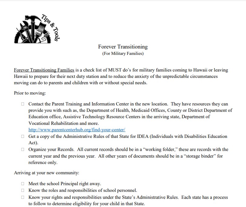 Forever Transitioning Families is a checklist of MUST-do’s for military families coming to Hawaii or leaving Hawaii to prepare for their next duty station and to reduce the anxiety of the unpredictable circumstances moving can do to parents and children with or without special needs.